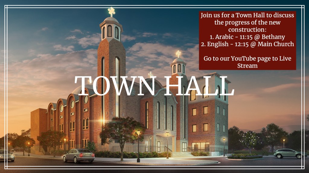 The Town Hall will take place both in Arabic and English. The Arabic meeting will be 11:15 in Bethany and the English meeting will be 12:15 in the main church. For those who cannot attend, it will be live streamed on our YouTube channel.